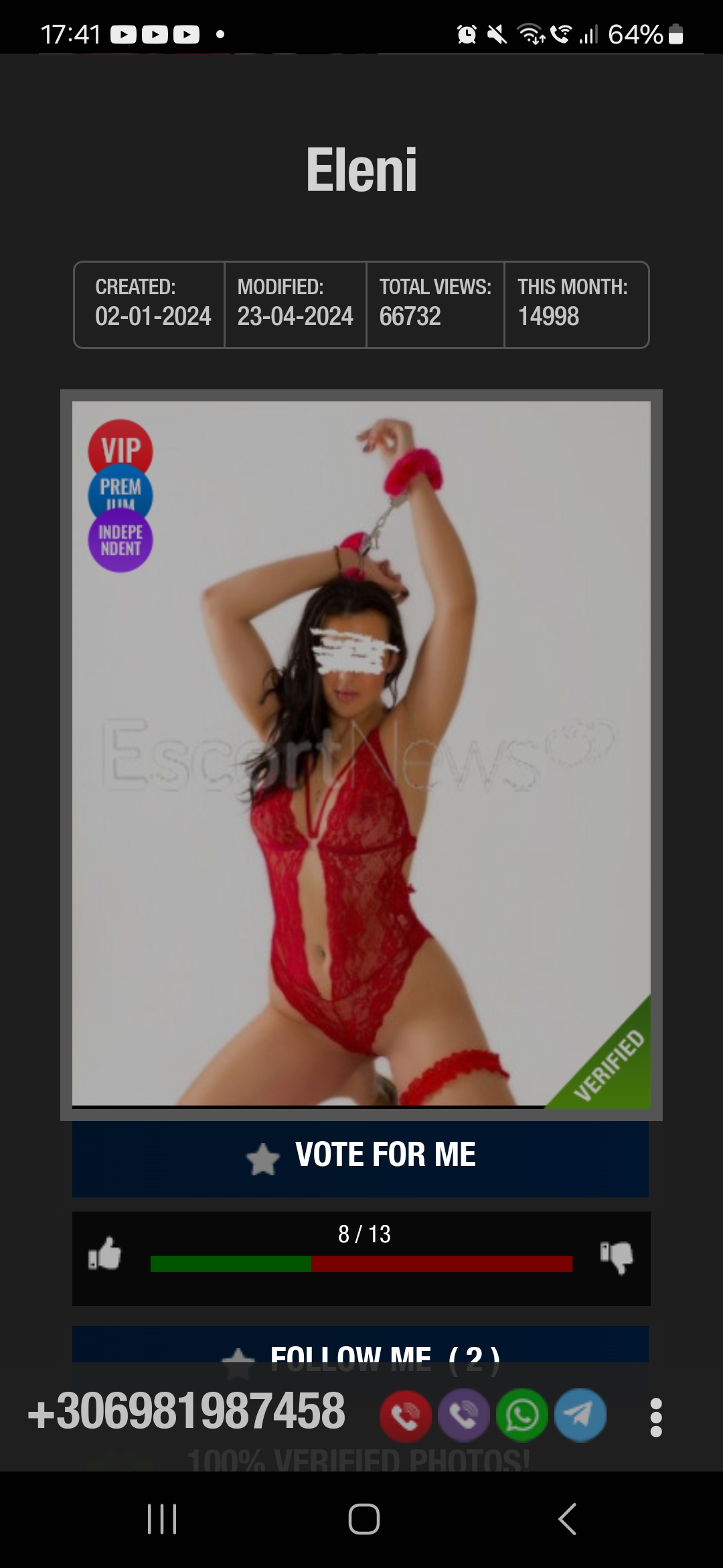 Παραθετω ενημερωση εδω αν κ η συναντηση εγινε σε διπλανη πολη. Δεν βρηκα κ καρτελα....ειμαι κ λιγο ασχετος. Eleni...νομιζω παλιοτερα ειχε κ αγγελια στο κανεσεξ. Ψηλη κοπελα γυρω στο 1.75 με πιασιματα. Μικρο στηθος με πιρσινγκ κ κωλο μεγαλουτσικο. Ναζιαρα παιχνιδιαρα που σε κερδιζει. Μιση Ελληνιδα μιση Σλοβενα. Υποδοχη μονο με κορδονακι οπως ζητησα. Λιγη κουβεντα...επικοινωνιακη...ντουζ...κ στο κρεβατι. Καλο στομαατικο βαθυ με το βλεμμα της σε μενα...ανταπεδωσα κ της αρεσε. Στασεις οτι της ζητησα. Κ αυτη βογγητα....προστυχολογα χωρις τις υπερβολες. Ζητουσε απαλο κ μετα δυνατο ρυθμο. Τελειωμα στα στηθια της. Κοστος 45 λεπτα 150....αλλα η συναντηση ξεπερασε την ωρα.. παραθετω κ ποια ειναι σε φωτο. Αυτα παιδες.