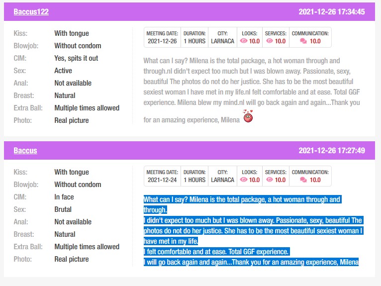 Η κοπέλα είναι εδώ από 24.12.2021 και στο europescortguide έχει το Ιανουάριο 7344 view. Βλέπε τις κριτικές. Έχει τρεις και από αυτές οι δυο είναι από το ίδιο πρόσωπο φαίνεται. 2021-12-26 17:27:49 και 2021-12-26 17:34:45, δηλαδή επτά λεπτά αργότερα. οκ.Την κοιτάζω εδώ και λίγες μέρες. Φαίνεται καλή στις φωτο αλλά τα σχόλια απο κάτω σαν να βάζουν νερά. Όπως και να 'χει λέω να την δοκιμάσω τις επόμενες μέρες.