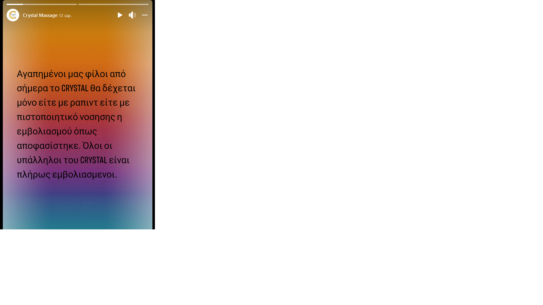 Crystal ανέβασε post ότι δέχεται κόσμο μόνο με πιστοποιητικό εμβολιασμού ή rapid.