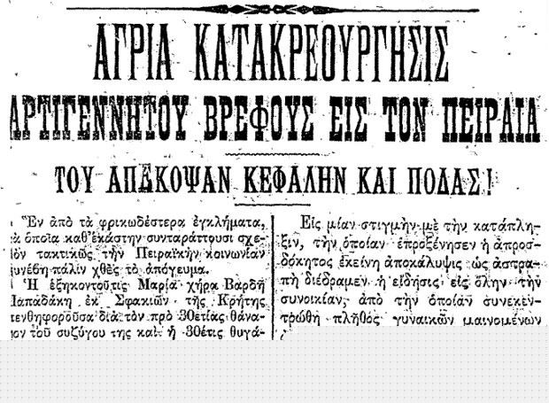 Φρικιαστικό έγκλημα στον Πειραιά. Η γιαγιά Μαρία Παπαδάκη τεμαχίζει το νόθο παιδί της κόρης της, ενώ αυτή βρίσκεται στο κρεβάτι του τοκετού, το βάζει στο τσουκάλι, το βράζει κι έπειτα το πετά.