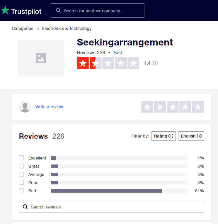 Seekingarrangement is rated "Bad" with 1.2 / 5 on Trustpilot