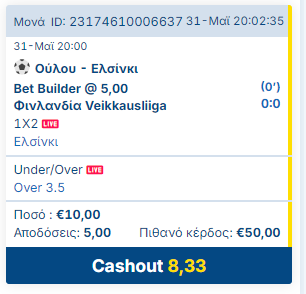 το δε γαμίδι Ελσίνκι αγγουρώθηκε στο 35ο λεπτό κι έληξε εκεί το σκορ (11.5 περίπου μέση τιμή) αν πήγαινε στο 2-0 θα ήταν ακόμη κοντύτερα στο 20 (19.5 περίπου).
