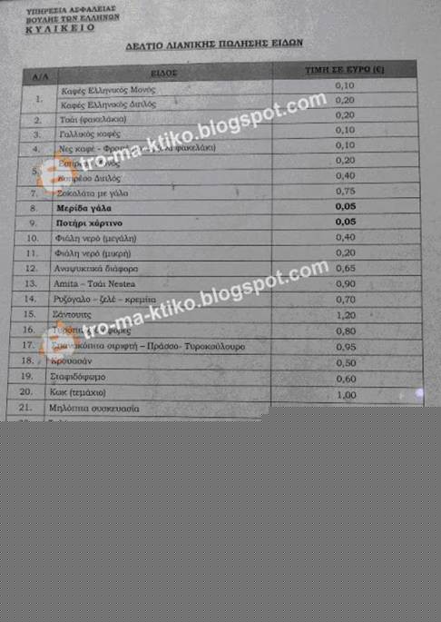 δεν νομιζω.....απλα ειναι κυλικειο τυπου ΚΨΜ.....οπως υπαρχουν κυλικεια και μεσα στις μεγαλες αστυνομικες διευθυνσεις κλπ......δλδ αυτο σημαινει οτι δεν μπορω κι εγω να παρω καφε απο εκει;Αυτός ο τιμοκατάλογος πρέπει να αφορά τους αστυνομικούς που υπηρετούν στη Βουλή,όχι τους Βουλευτές.Γι΄αυτό υπογράφει ταξίαρχος και πάνω λέει "υπηρεσία Ασφαλείας".